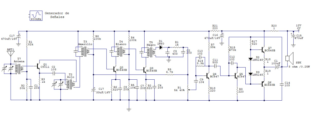 Para tener claro el circuito sobre el que vamos a trabajar, incluyo el diagrama completo del receptor de radio en amplitud modulada.