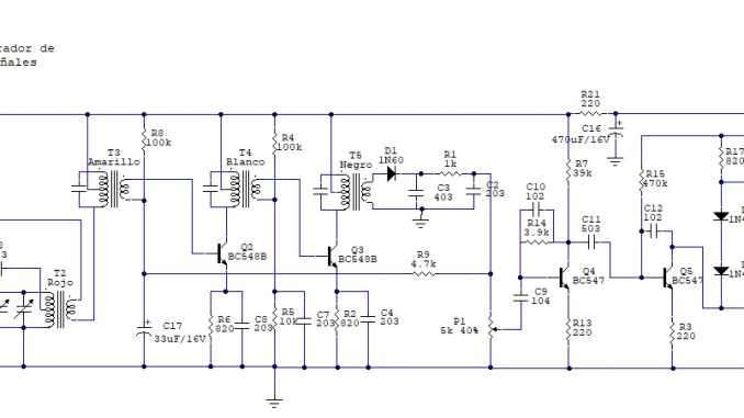 Para tener claro el circuito sobre el que vamos a trabajar, incluyo el diagrama completo del receptor de radio en amplitud modulada.