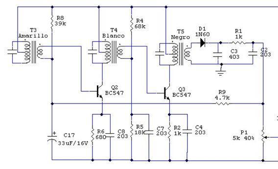 El circuito arriba mostrado presenta la etapa de FI de nuestro Receptor Superheterodino, desde el trasformador de señal T3 (Amarillo) hasta el transformador T5 (Negro). Los transistores Q2 y Q3 son los encargados de amplificar la señal de FI y por consiguiente tienen una ganancia.