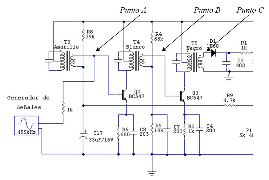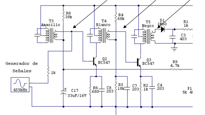 Esta primera prueba consiste en realizarla sin voltaje de alimentación, conectando el generador de señales (Calibrado a 455 Khz con modulación interna) al bobinado secundario del transformador amarillo, mediante una resistencia de 300 a 1kohm en serie con el generador de señales.