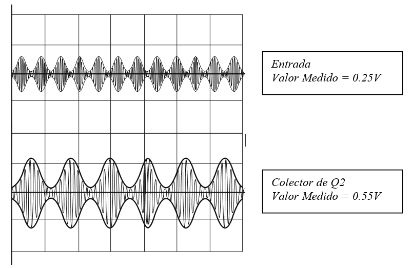 En la prueba 2 se puede apreciar  significativamente el aumento de nivel de la señal, ya que al recibir alimentación, el circuito comienza a amplificar (Colector de Q2 y Q3). En esta etapa se realiza una segunda calibración hasta una máxima lectura en el osciloscopio, calibración que será definitiva y dejará lista esta etapa para ser conectada al mezclador y RF.
