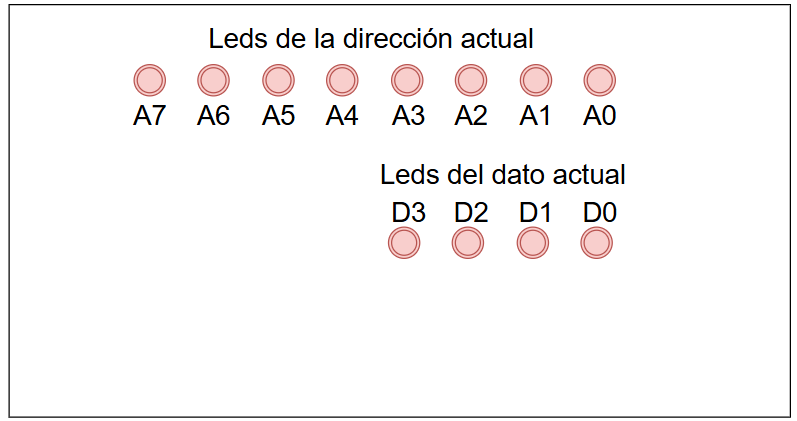 En principio, necesitaremos 8 leds para mostrar las direcciones de memoria y 4 leds para mostrar el contenido de una celda de memoria. Esos mismos 4 leds nos pueden servir para ingresar los datos, en el modo de edición.