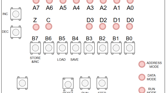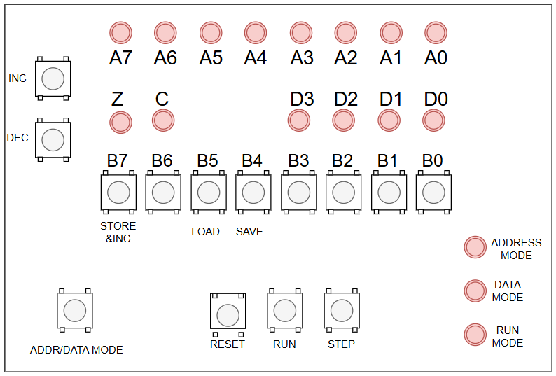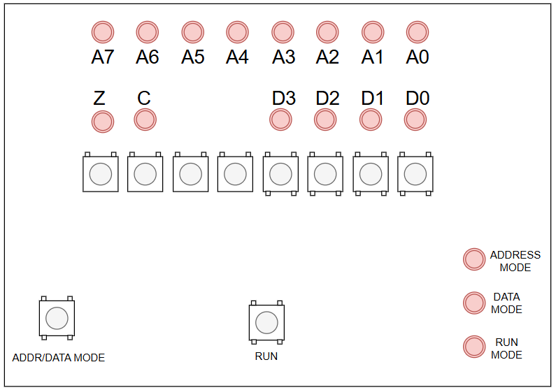 Como debemos cambiar de modo, necesitamos al menos un botón para fijar el modo. Por practicidad usaré dos botones. Uno para ejecutar el programa al que llamaré RUN y otro para cambiar el modo de edición al que llamaré ADDR/DATA MODE, y que nos permitirá entrar al modo de edición y también el elegir el modo de edición. El esquema quedaría así:
