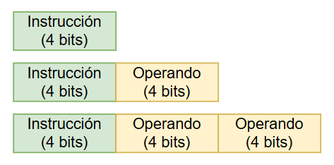 Primeramente, hay que considerar que el tamaño de las instrucciones es también de 4 bits, y, por lo tanto, solo podemos definir 16 instrucciones de un solo nibble. La cantidad de operandos sí es variable, pero trataremos de que que sea lo más reducida posible.
